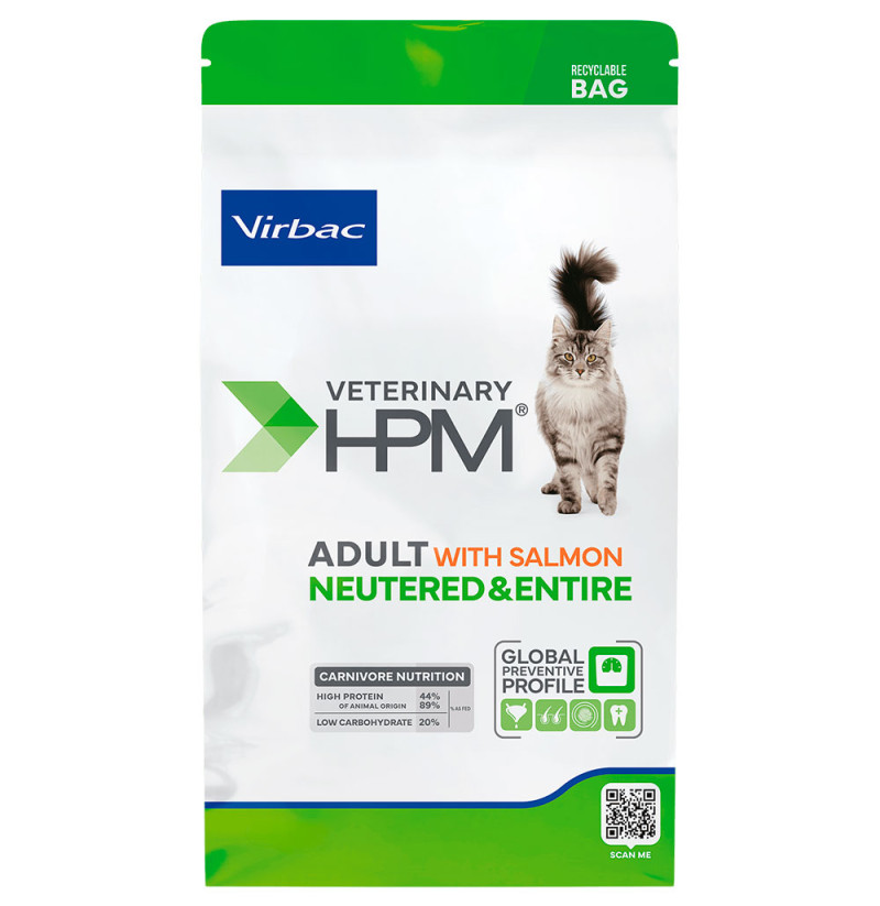 La fórmula Veterinary HPM Adult Neutered & Entire con Salmón de Virbac está diseñada para gatos adultos a partir de 1 año de edad, tanto esterilizados como no esterilizados. Su composición combina una alta proporción de proteína animal con bajo contenido en carbohidratos (≈ 20 %) para adaptarse a su naturaleza carnívora, favorecer la masa muscular magra, controlar el peso y cubrir las necesidades de gatos con menor actividad.