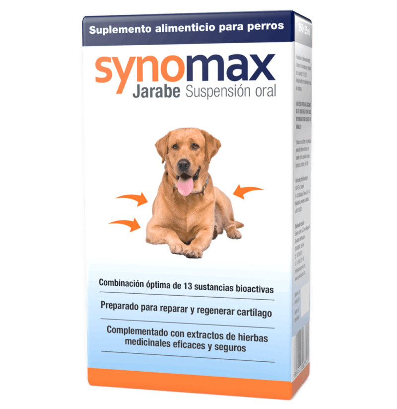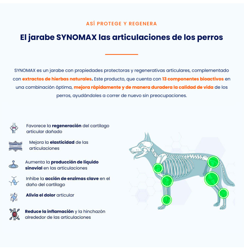 SYNOMAX es un jarabe con propiedades protectoras y regenerativas articulares, complementado con extractos de hierbas naturales. Este producto, que cuenta con 13 componentes bioactivos en una combinación óptima, mejora rápidamente y de manera duradera la calidad de vida de los perros, ayudándoles a correr de nuevo sin preocupaciones.