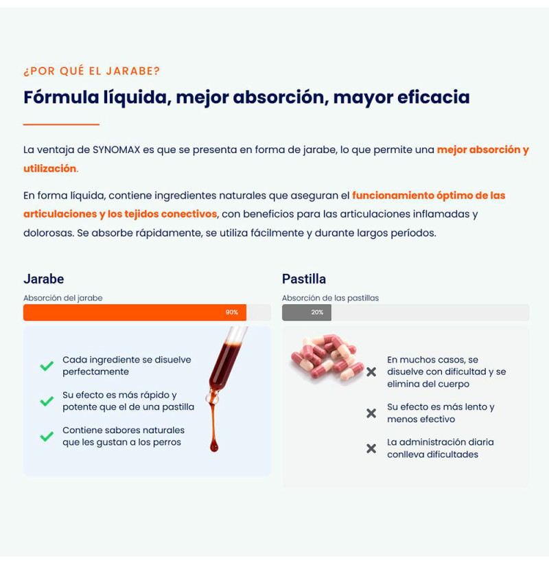 La ventaja de SYNOMAX es que se presenta en forma de jarabe, lo que permite una mejor absorción y utilización.