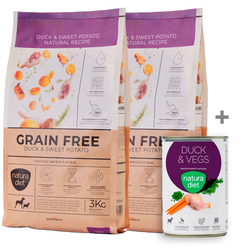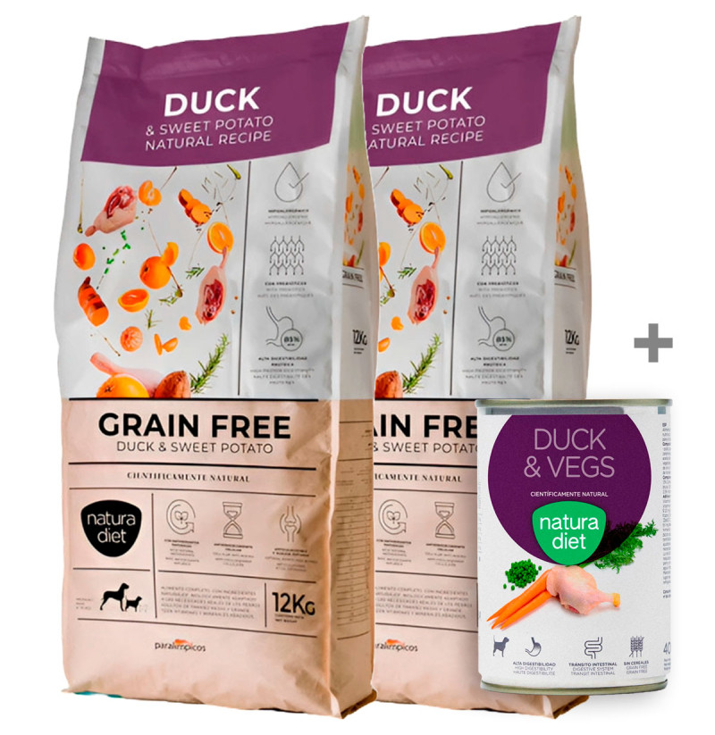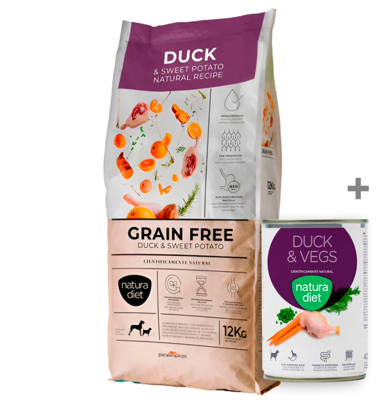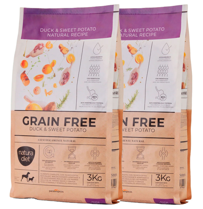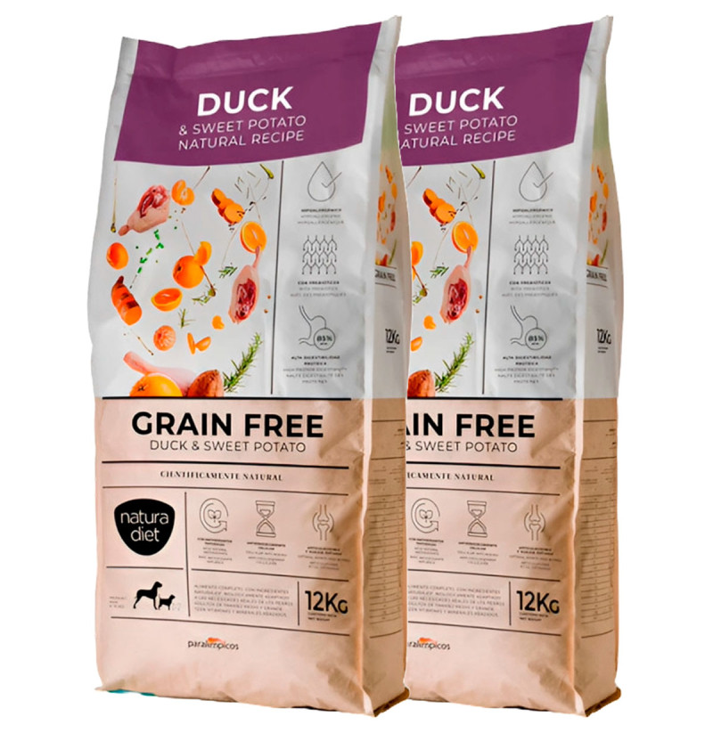 NATURA DIET DOG Grain Free Duck & Sweet Potato es un alimento seco de alta calidad, especialmente formulado para perros adultos de raza media y grande, que destaca por su receta sin cereales, ideal para animales con sensibilidades alimentarias o intolerancias al gluten. Su principal fuente de proteína animal es el pato, una carne de alta digestibilidad y sabor único que, combinada con batata (sweet potato), proporciona una excelente fuente de energía y fibra.