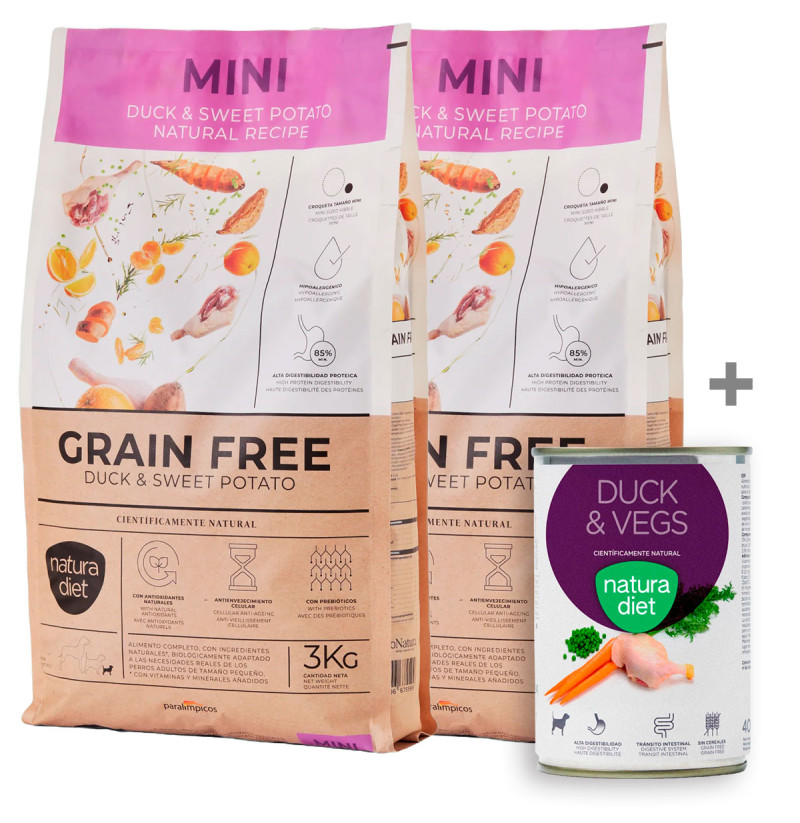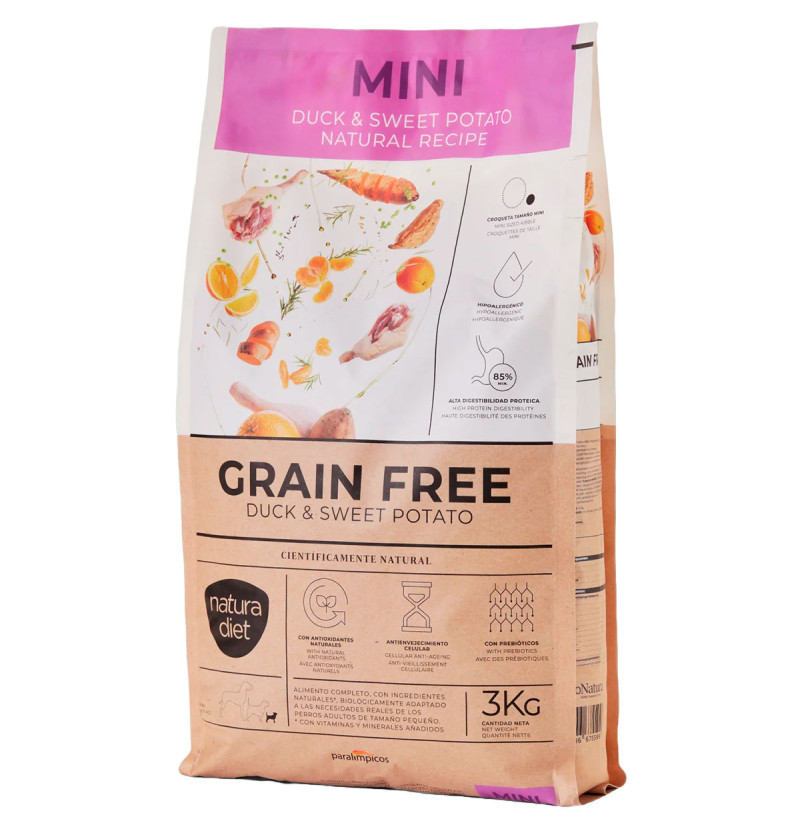 NATURA DIET DOG Grain Free Mini Duck & Sweet Potato es un alimento seco de alta calidad, especialmente formulado para perros adultos de raza mini o pequeña, que destaca por su receta sin cereales, ideal para animales con sensibilidades alimentarias o intolerancias al gluten. Su principal fuente de proteína animal es el pato, una carne de alta digestibilidad y sabor único que, combinada con batata (sweet potato), proporciona una excelente fuente de energía y fibra.