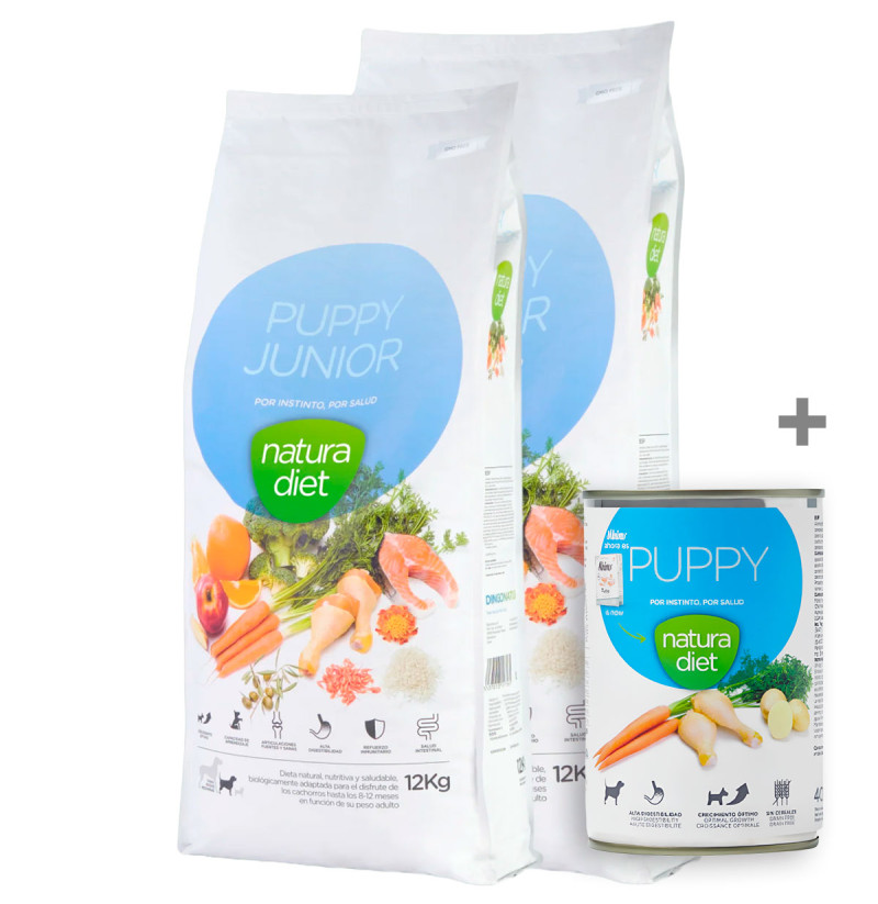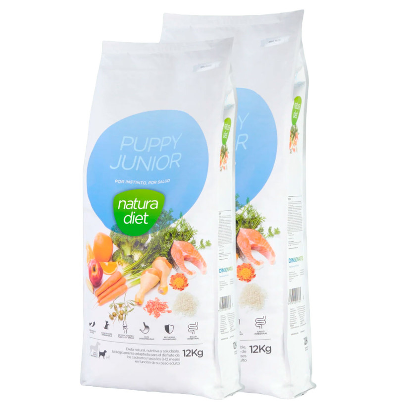 Este pienso también se fabrica para perros cachorros de raza pequeña o mini Natura Diet Puppy Junior Mini (click para ver) y para perros cachorros de raza grande Natura Diet Puppy Junior Large Breed (click para ver)