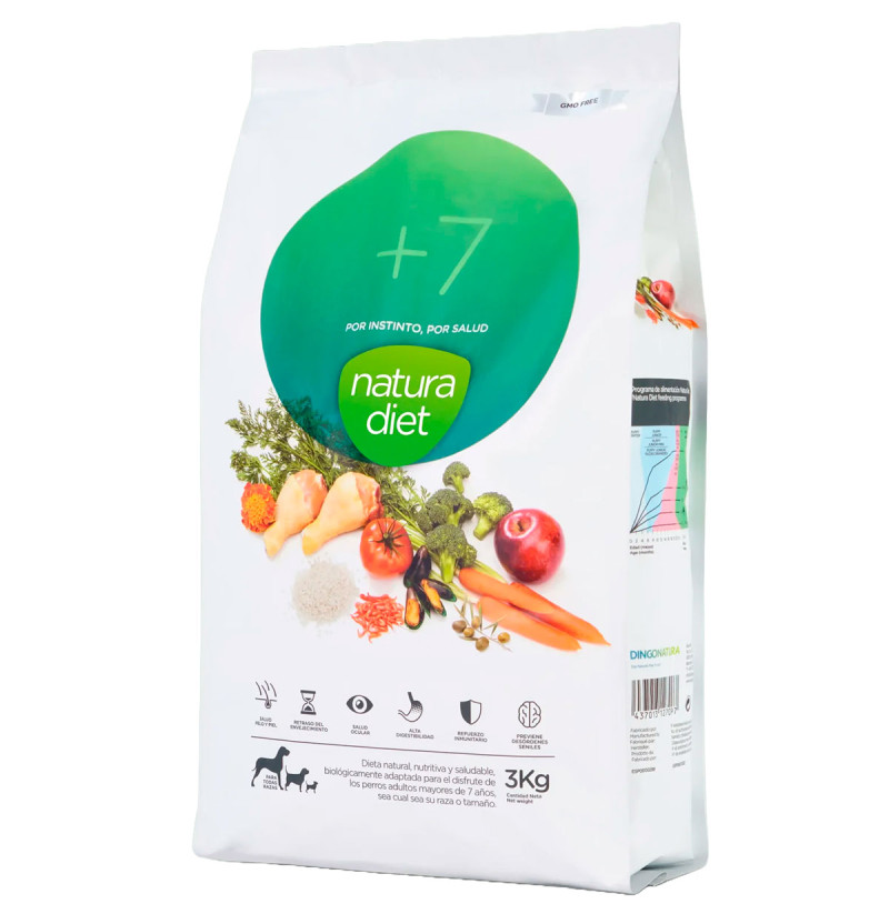 Con Natura Diet +7 en la etapa de madurez, intentamos suplir deficiencias anteriores debidas a alimentos de baja calidad, proteger su sistema enzimático y osteoarticular, ralentizar sus desórdenes seniles, cuidar su mucosa y flora intestinales