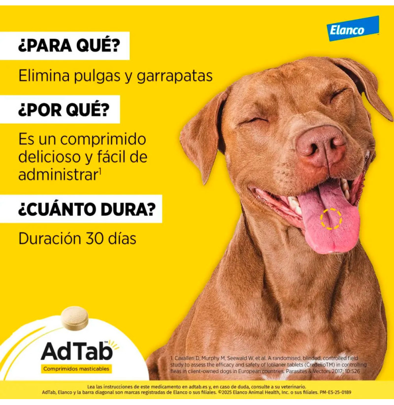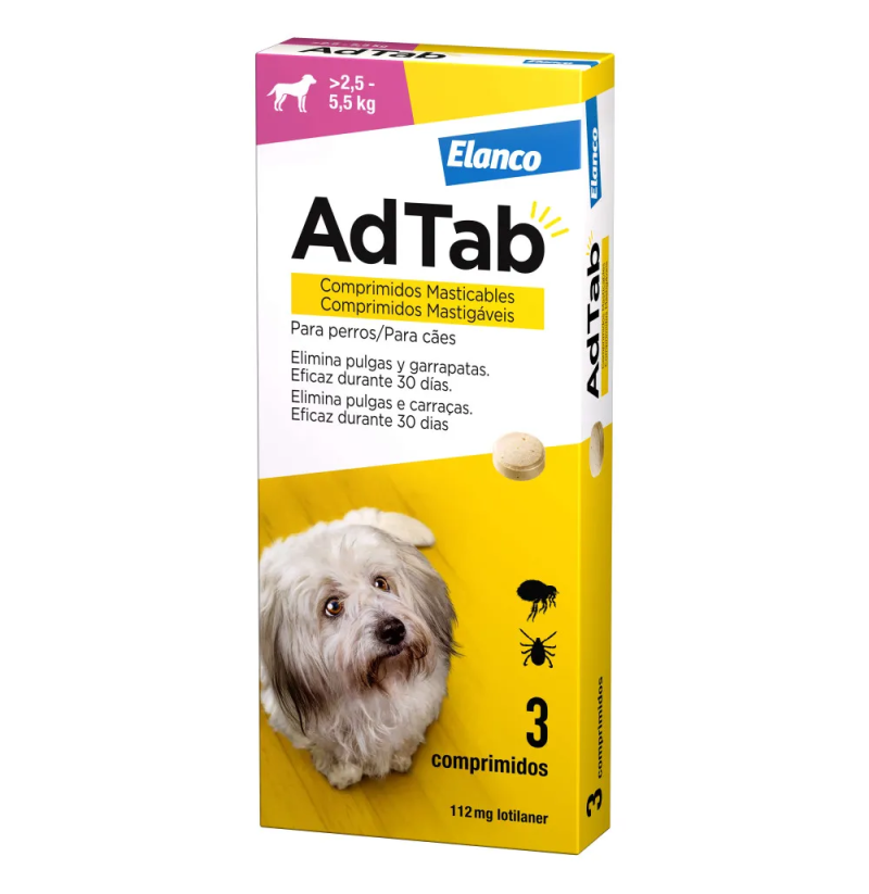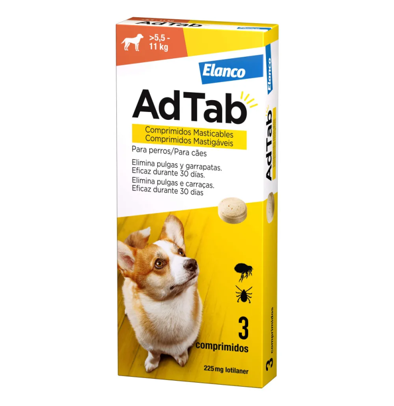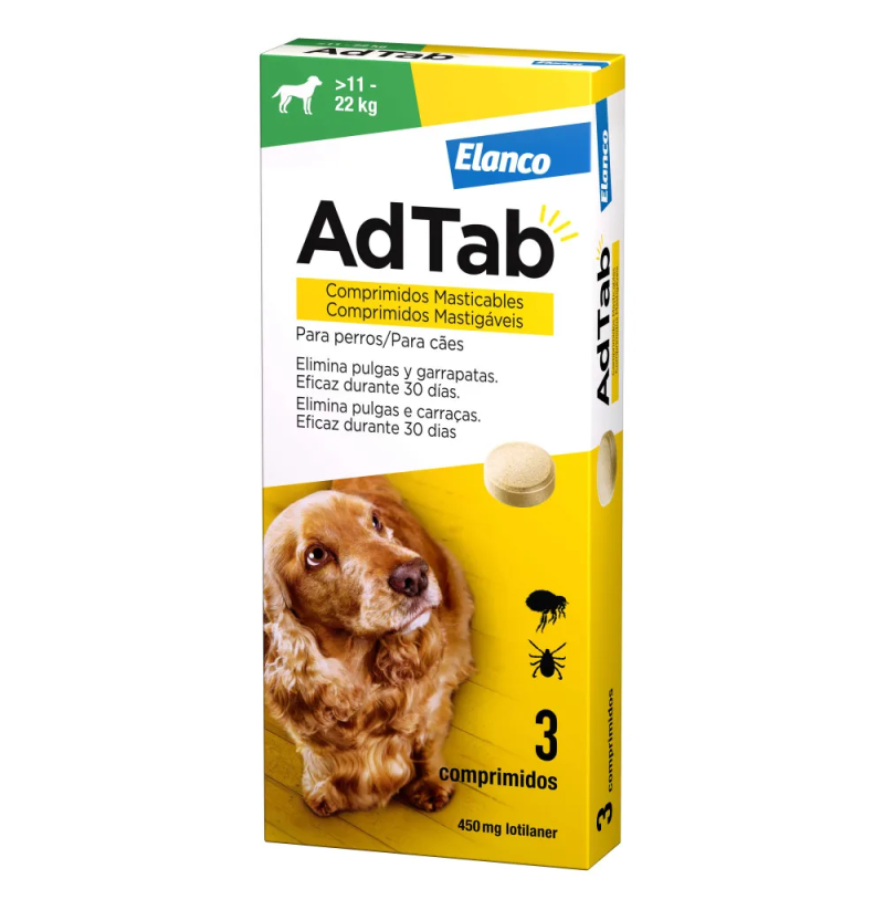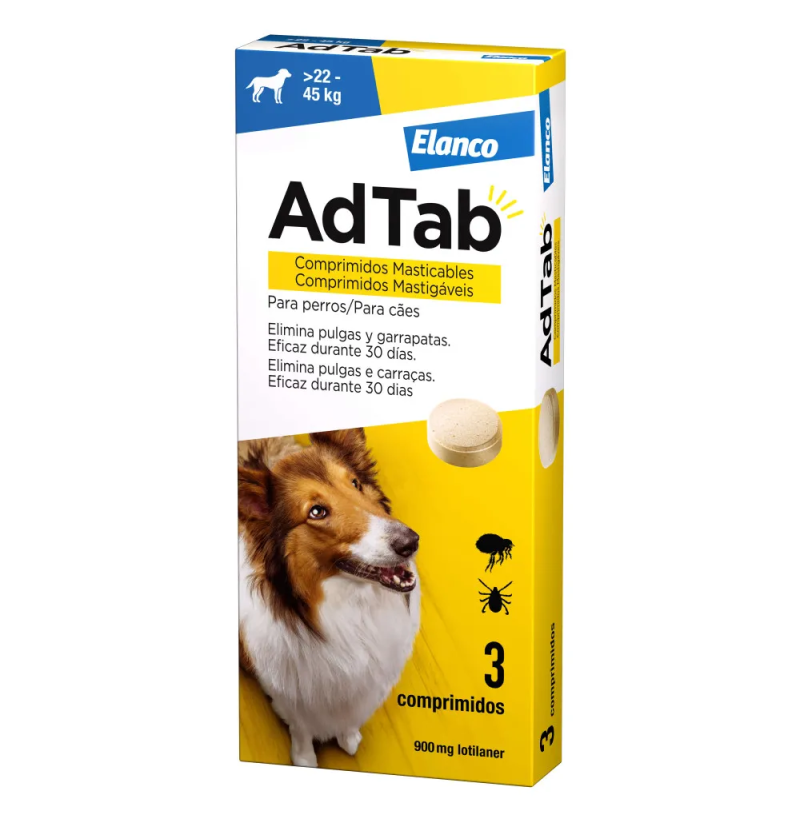 AdTab de 3 pastillas es un antiparasitario oral para perros que combina eficacia, seguridad y facilidad de uso. Gracias a su principio activo Lotilaner, actúa de forma rápida eliminando pulgas y garrapatas con una protección de hasta 30 días por comprimido. Esta presentación incluye 3 comprimidos masticables, lo que garantiza hasta 3 meses de tranquilidad frente a parásitos externos. 1 comprimido = 1 mes de protección.