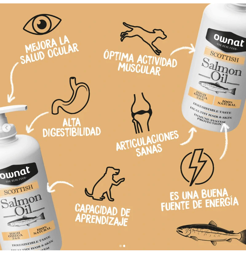 Suplemento 100 % natural de aceite de salmón escocés, rico en ácidos grasos esenciales Omega-3 y Omega-6 (DHA y EPA), formulado para favorecer la salud de la piel, pelaje, articulaciones y sistema inmunitario de perros y gatos.
